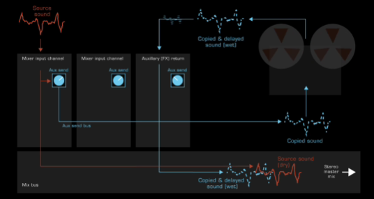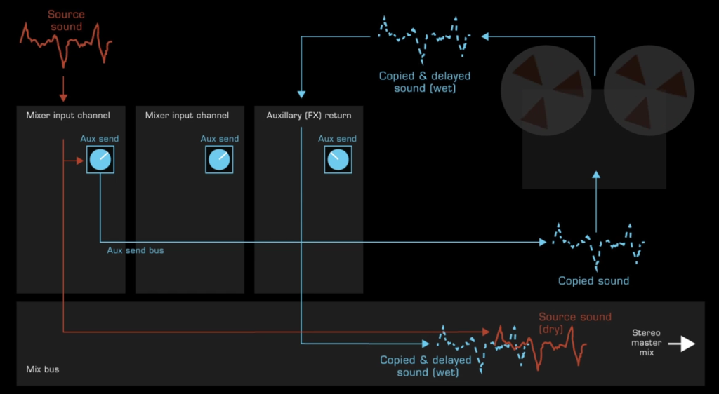 At its core, delay is created by making a copy of a source signal and playing it back later in time. There are many ways to create this copy today, but the original method relied on auxiliary send buses and dedicated tape machines.